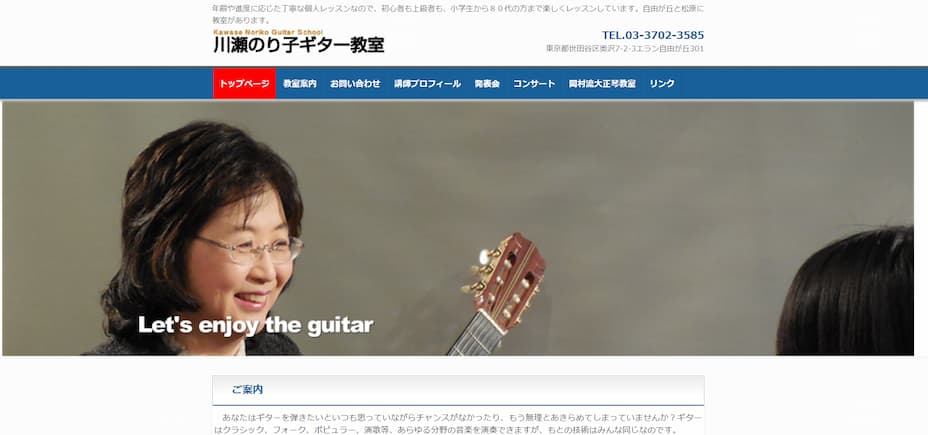 自由が丘にある川瀬のり子ギター教室は、基礎技術の習得に重点をおいたレッスンなので誰でもやさしく学べ、無理なく上達できます。楽譜が読めなくても大丈夫、年齢や進度に応じた丁寧な個人レッスンなので、初心者から上級者、小学生から80代のシニア世代の方まで楽しくレッスンしているギター教室です。年に一回発表会を開催しているので、目標に向かってレッスンをうけることができます。