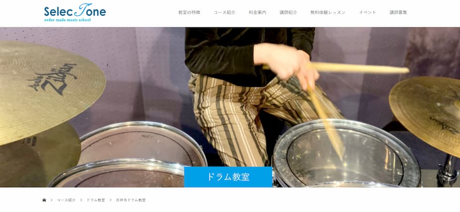 SelecToneミュージックスクールは、自宅の近くのスタジオや勤務先の近くなど、吉祥寺はもちろん、他の好きな場所でレッスンを受けることができるドラム教室です。レッスン内容は、担当の講師と相談し、「この曲を練習したい!」「基礎的な部分を見てほしい」など、自由にレッスン内容を決めることができるため、自分の理想のドラマーに近づくことができます。また、原則レッスンは1日1コマですが、プライベートや仕事が忙しく通う時間が取れないなどの理由があった時は、2コマ続けてレッスンを受講することも可能。無駄なくレッスンを消化できるため、忙しい方にもおすすめです。